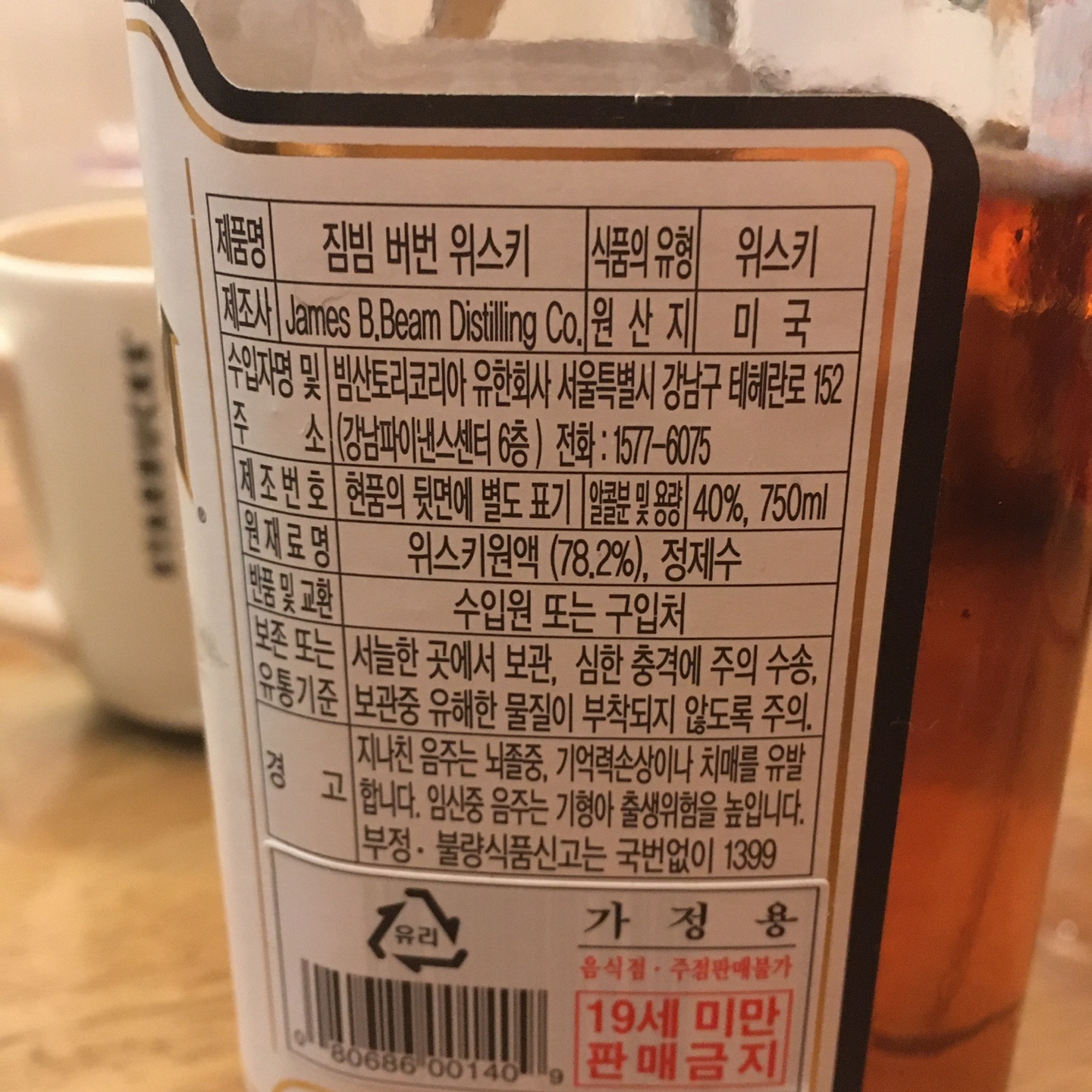 마지막 사진은 제가 산 짐빔버번 위스키인데요. 짐빔 가격은, 마트에서 3만원 중반대에서 구입했었습니다. 미국인들의 소주라고 불리는 버번위스키의 대표라고 하지요.